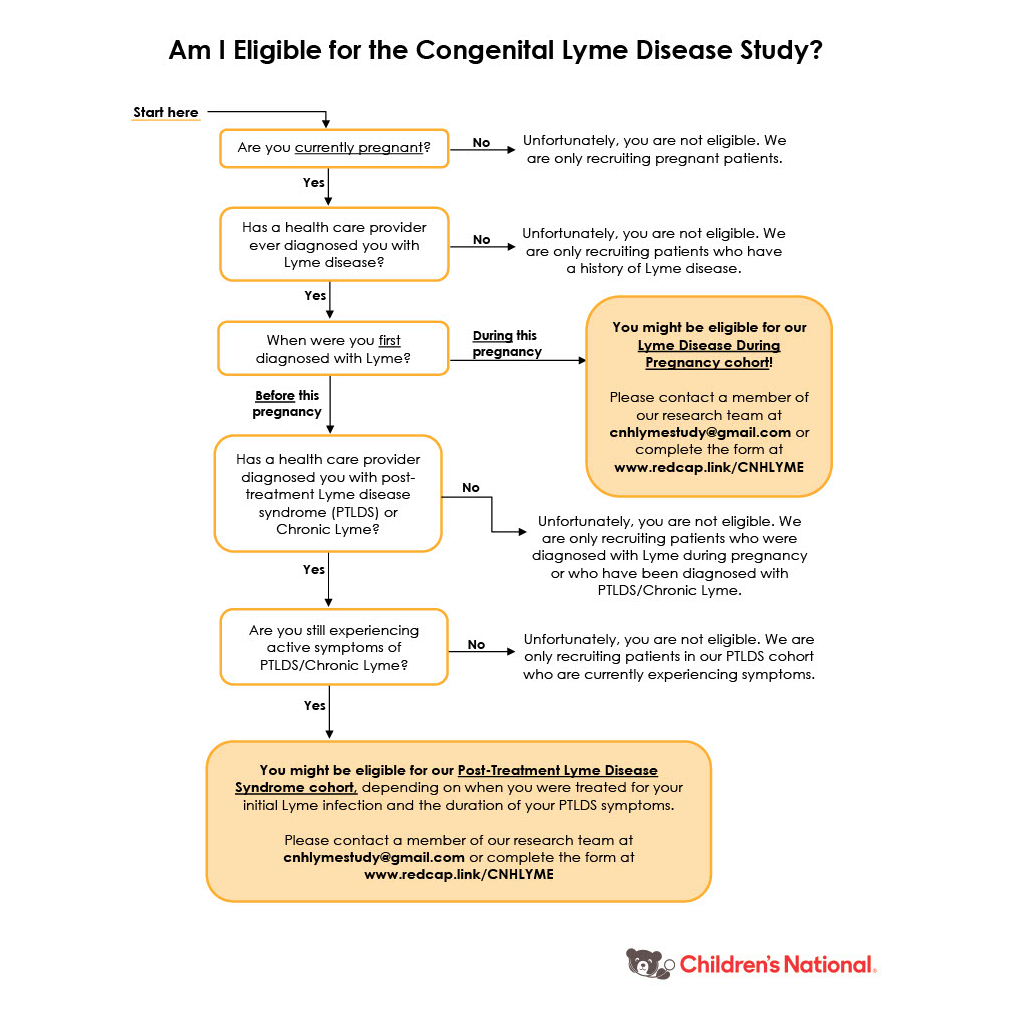 This flowchart, available as both a JPG and PDF, gives an at-a-glance summary of our inclusion and exclusion criteria for each of the study’s two cohorts. This can be used to help screen your patients or clients for initial eligibility in our study. If they are eligible, please refer them to www.redcap.link/CNHLYME to complete the online screener.